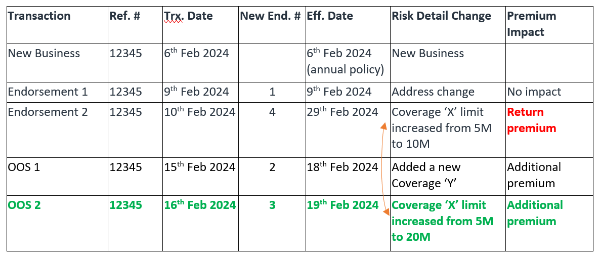 Based on the re-sequence, after “OOS 2”, when “Endorsement 2” is recalculated, an attributable return premium is invoiced on 29th Feb for 29th Feb till the end of the policy term for the decrease in coverage limit as per the rating algorithm.