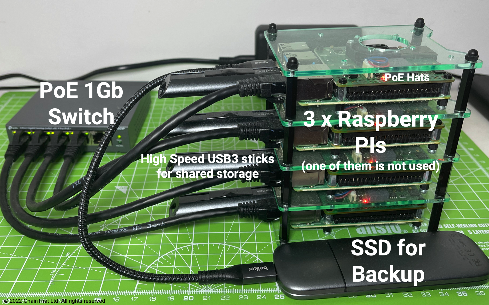 Each Raspberry Pi had a wireless connection to my home internet for external access as needed (ingress or inbound requests for SSH and secure web browser access) – controlled by port forwarding on the home broadband route. To support the resilience and availability storage, external USB 3 sticks were used to host a shared file system. For backups, we connected one node with a high-capacity external SSD drive.