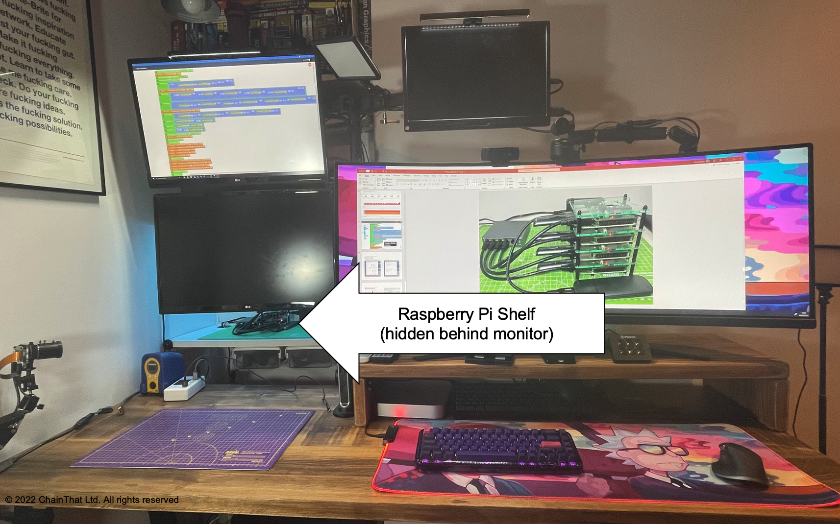 During lockdown, I volunteered the use of my home office to host the Raspberry Pi, which allowed me to play datacentre engineer (in case we needed to move cables, power things down, etc.). The advantage of this was that the device could easily fit on the top shelf at my home desk (see picture below). Internet connection was achieved over my home internet; all we had to do was provide the secure remote access. The team was based in various locations across India, while I located the Raspberry Pi’s in Twickenham (UK).